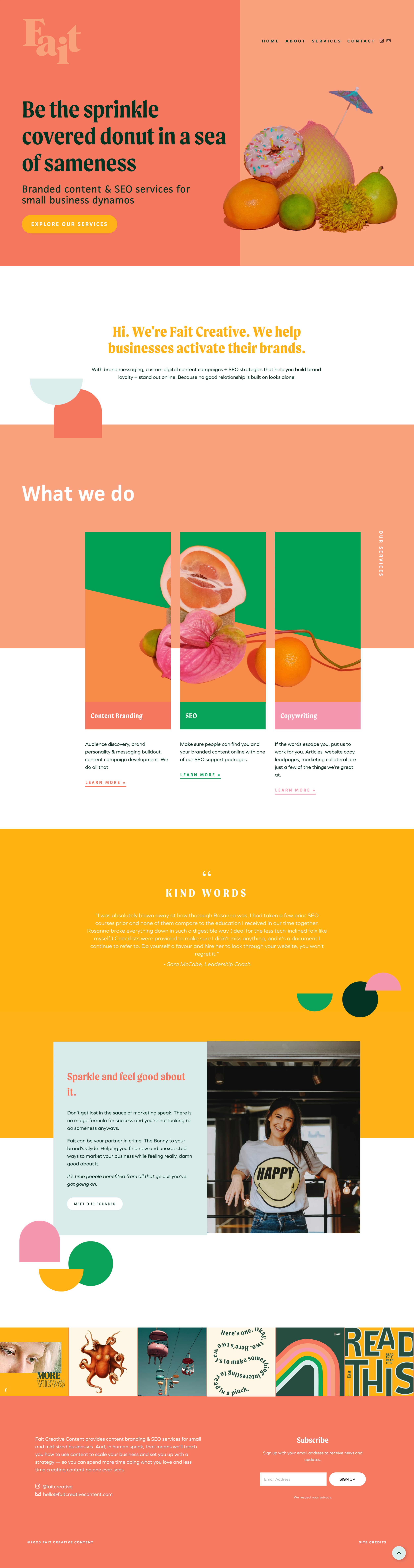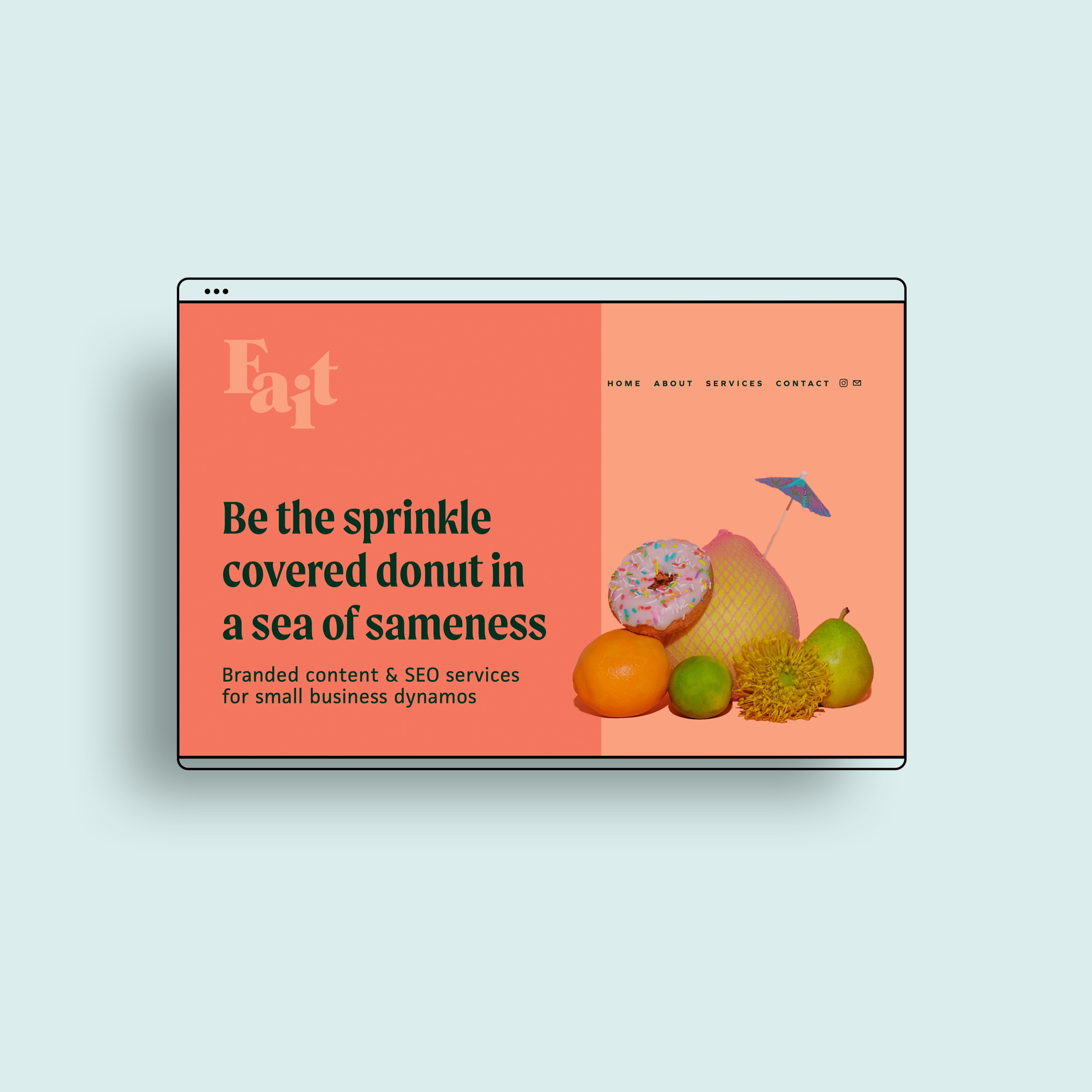 Owner Rosanna knew that she wanted fun shapes and a mid-century modern agency vibe for the Fait brand identity. With that in mind, a set of shapes that could be used as decorative elements were created. Spot the shapes throughout the website – some are even animated!